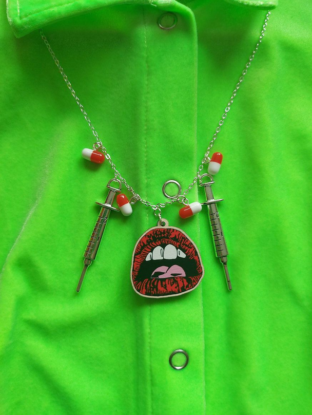Necklace made from 1.5" x 1.4" maple veneered mdf wooden charm printed in full colour on the fron of the charm, with 2 61.4 x 14mm metal silver needle charm and 4 12 x 6mm pill bead. Also with a silver plated jumpring and a silver plated cable chain, 23.6" length x 2.5mm thickness with a lobster claw clasp.