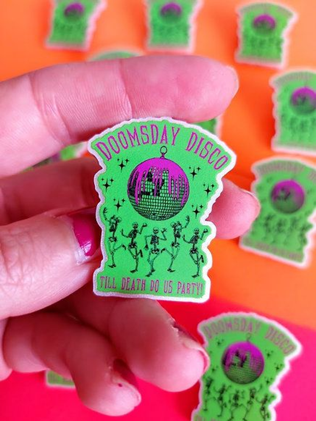 The Doomsday Disco design is printed in full colour on the front of the pink metallic badge onto an environmentally friendlier alternative to enamel pin badges. Our acrylic pin badges are digitally printed onto 3mm thick recycled clear acrylic and custom cut to whatever shape you choose, before fixing a sturdy metal pin on the reverse with your choice of fixing.Recycled acrylic (R-MMA) looks and performs as well as standard virgin acrylic (PMMA) whilst being VOC and HFC free and significantly kinder to the environment.