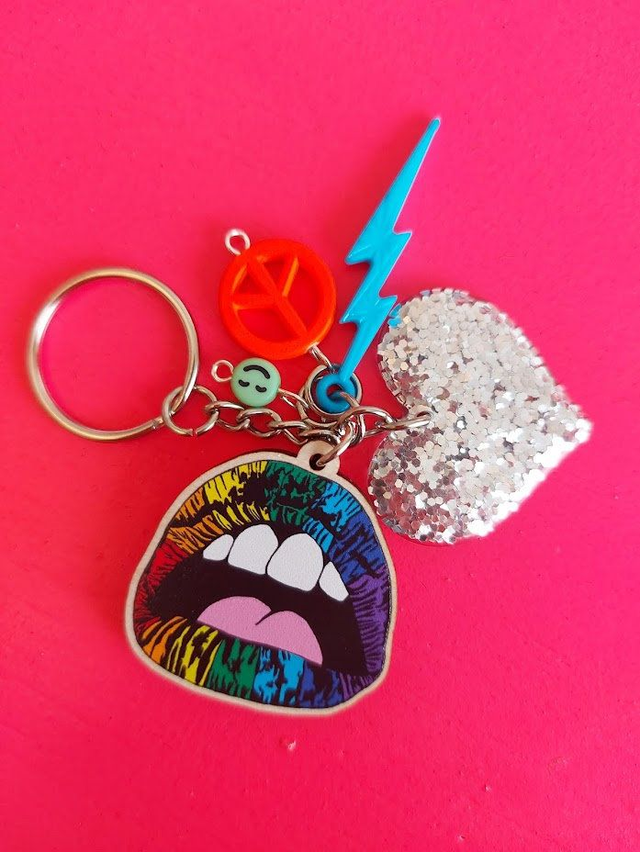 Rainbow Lips Keyring made from 38mm (1.5") maple veneered mdf wooden charm, with a silver plated jumpring and a silver nickel metal keychain. 2.3mm thickness for the keyring and 1.5mm for the chain. Also with a plastic silver glitter heart charm, a blue lightening bolt charm, an orange peace charm and a green smiley charm!