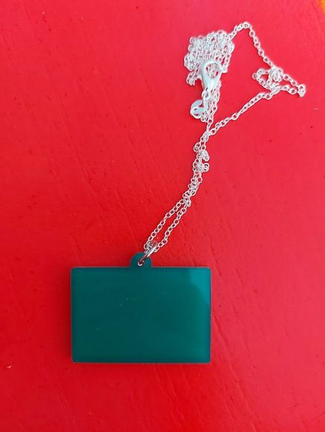 Necklace made from 38mm (1.5") x 1.2" acrylic charm which glows under UV light printed in full colour on the front of the charm, with a silver plated jumpring and a silver plated cable chain, 18" length x 1.2mm thickness with a lobster claw clasp.