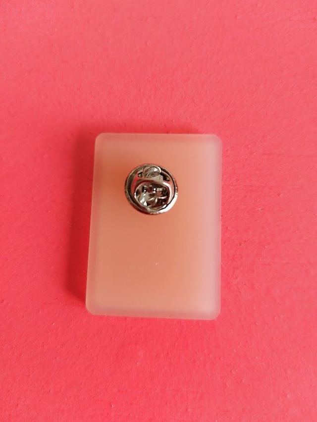 38mm (1.5") x 1.5" acrylic pin badges made from 100% recycled and recyclable plastics that have reached the end of their life-cycle and were destined for landfill or incineration, silver metal butterfly clutch.