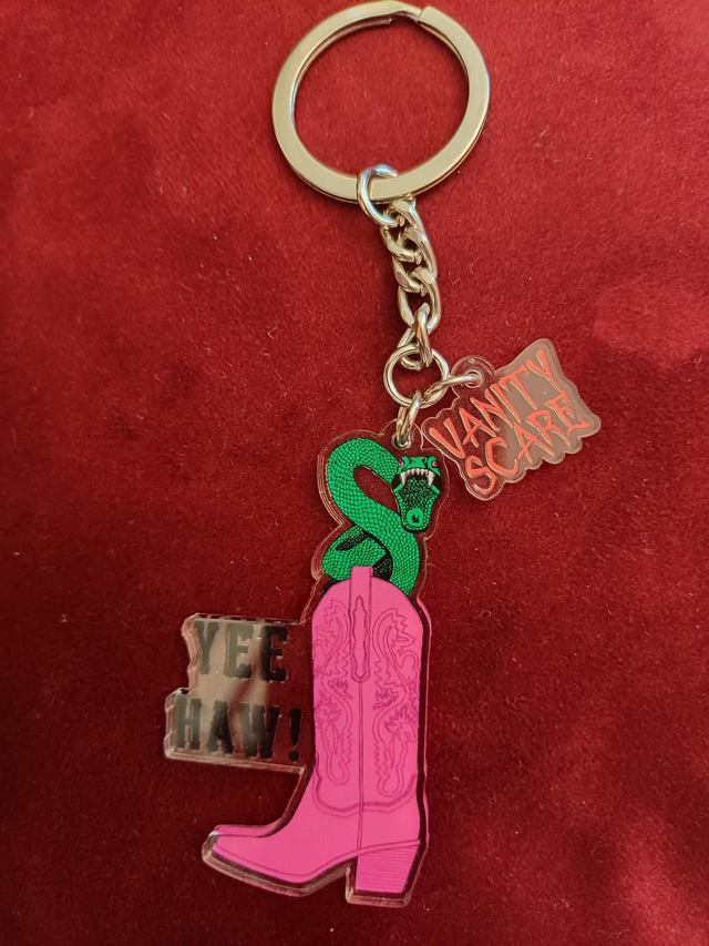 Yeehaw keyring made from 2.5" acrylic charm, with a silver plated jumpring and a silver nickel metal keychain. 2.3mm thickness for the keyring and 1.5mm for the chain.